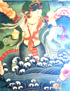The Naga symbolizes life force, fertility, and the interconnectedness of all elements. In sacred art, they are often depicted coiled around treasure vases or protecting stupas and temples, symbolizing their role as guardians of sacred wisdom and the natural world.